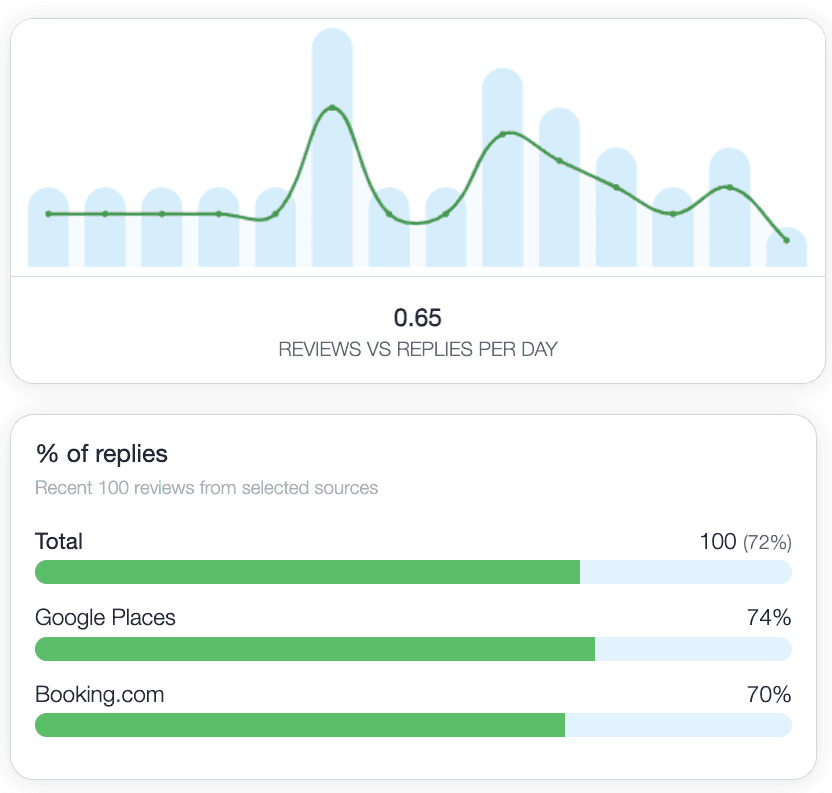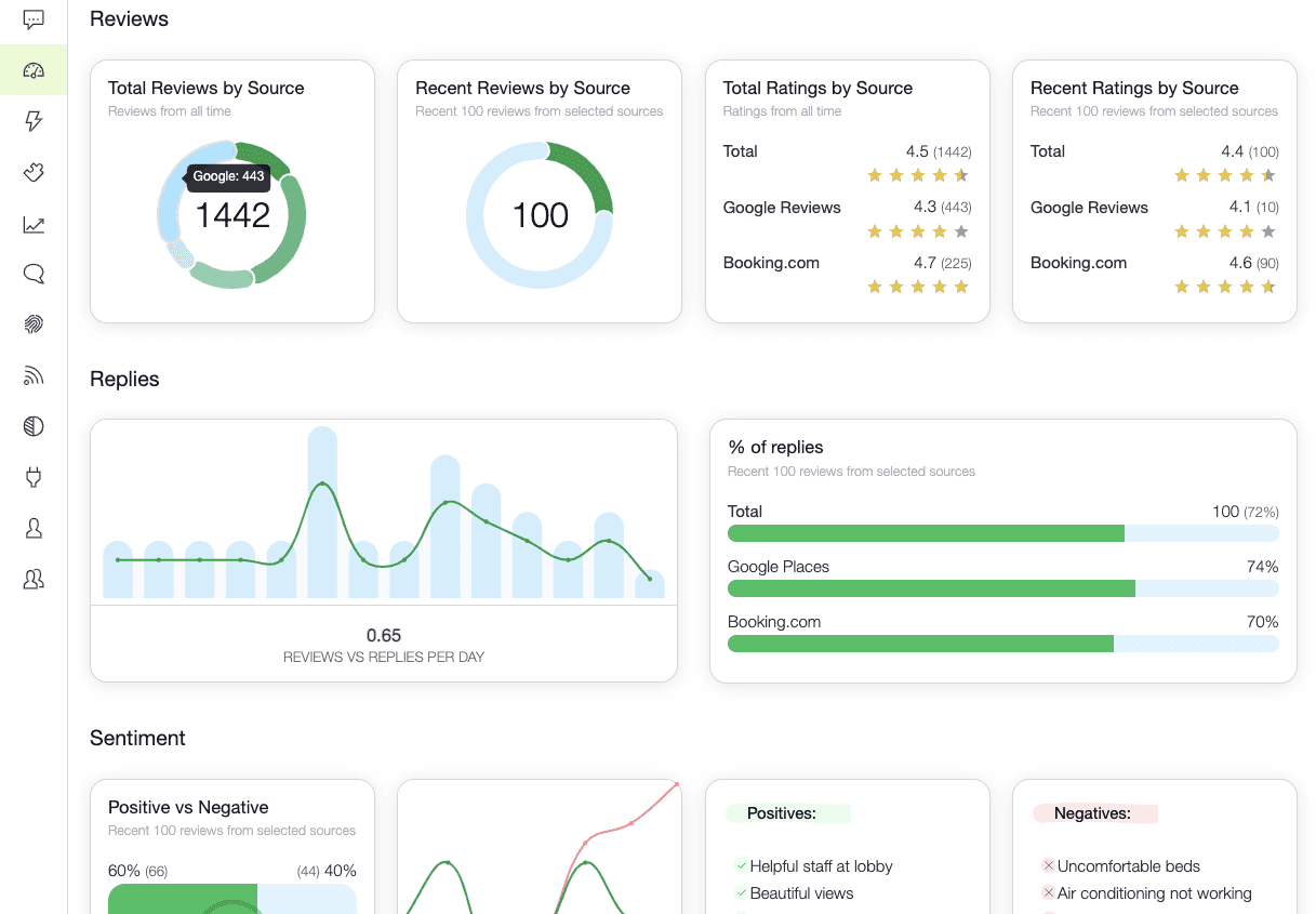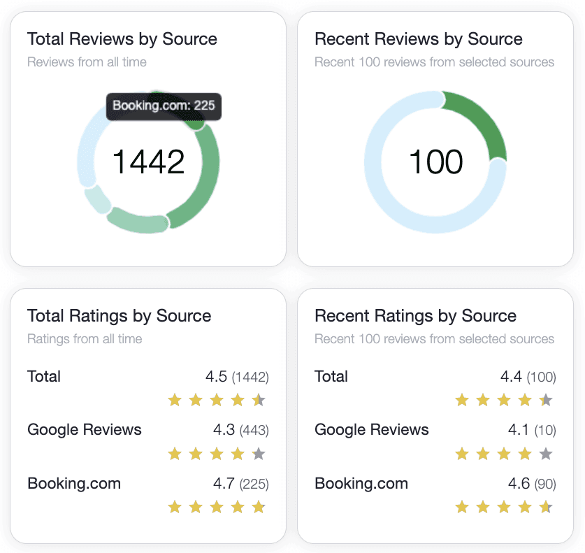 In full version reviews from popular travel platforms are processed within minutes of being posted. Social media content requires a bit more magic to detect mentions of your property across the vast social media landscape, but we still collect the data within a few hours—depending on the platform.
