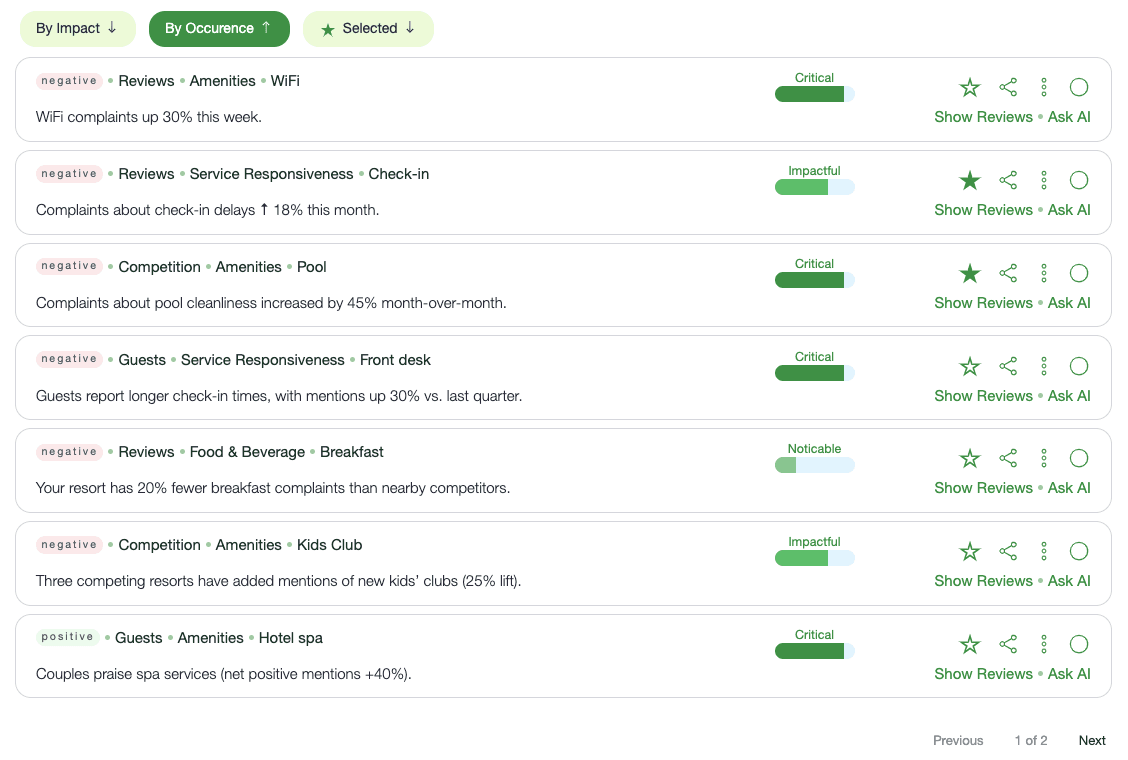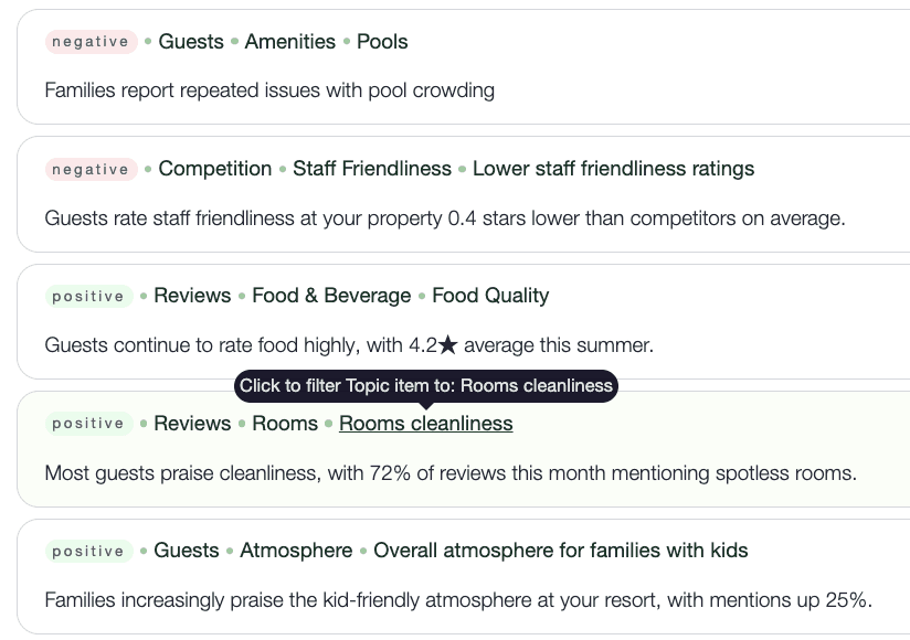 Unlike keyword-based tools that rely on rigid categories — like grouping all complaints under ‘cleanliness’ or ‘service’ — we go beyond labels. The system understands the real issues, delivering context-rich insights rather than shallow counts. And when a signal is highly specific — like ‘pool towels not being refreshed’ or ‘espresso machine frequently out of order’ — it’s surfaced too.