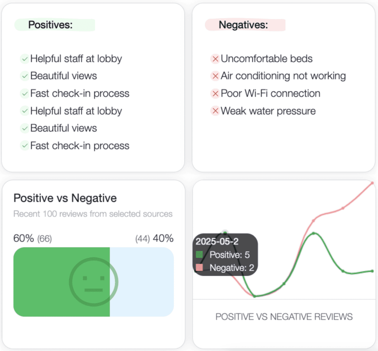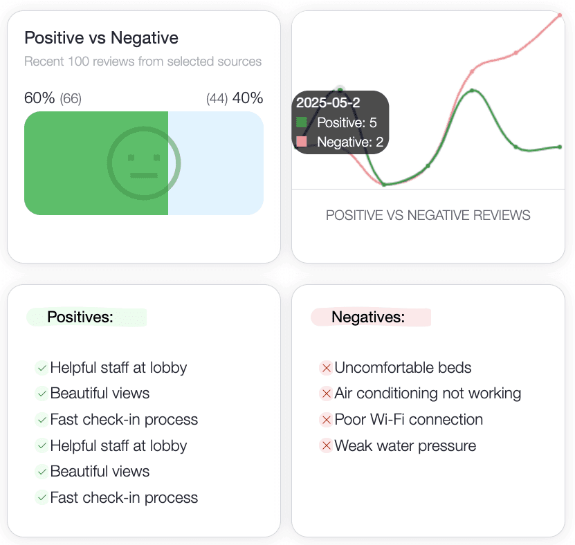 Explore AI-powered reports, review insights, and live trend analysis - built for independent and boutique hotels, updated with the latest 100 reviews in the free version.